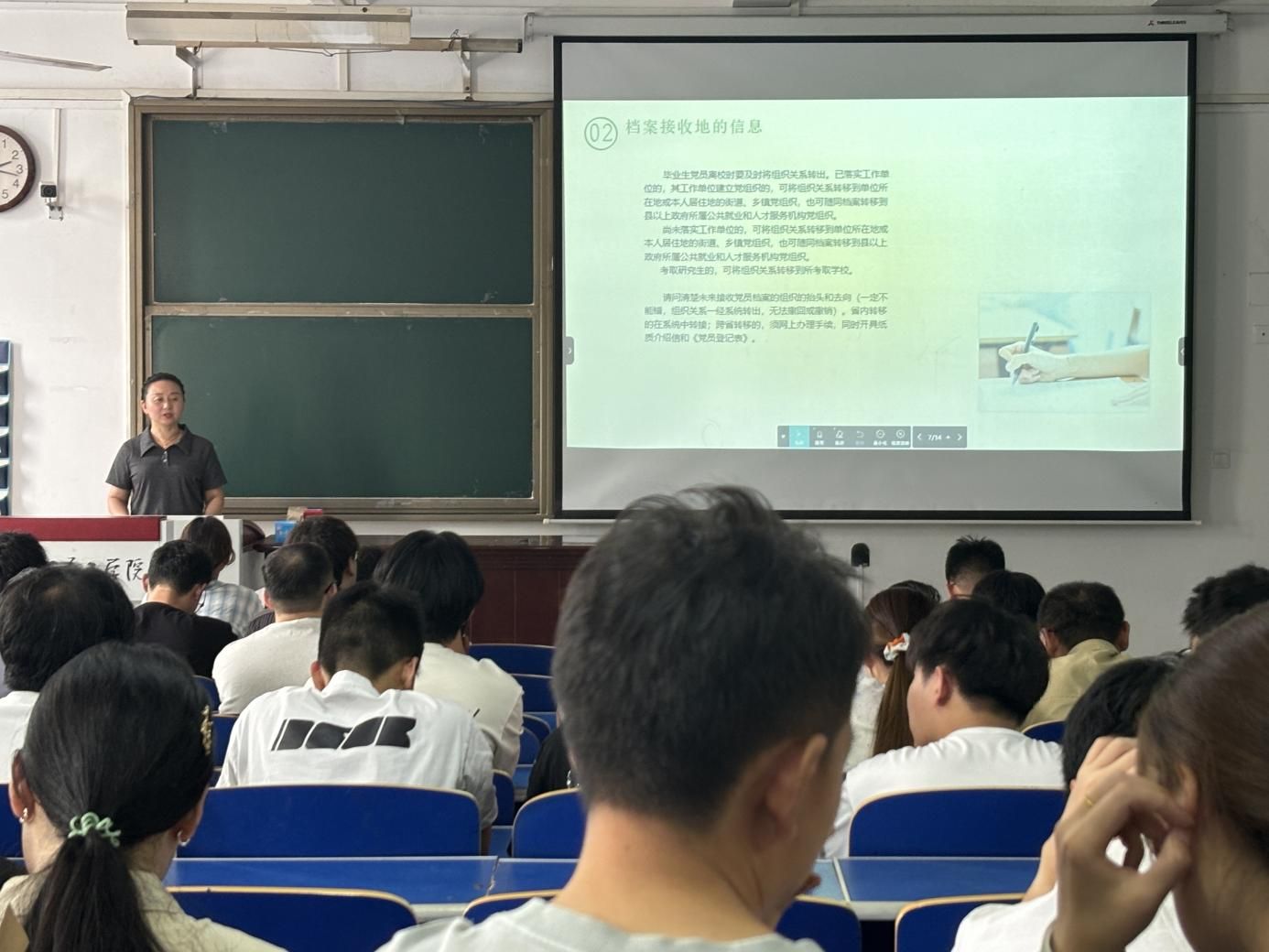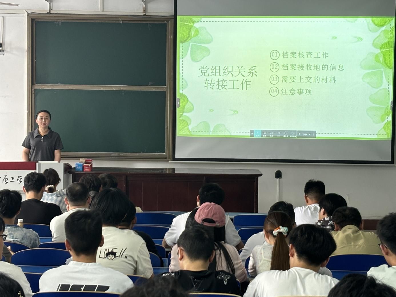 会议开始,薛松对2025届党支部毕业生进行了离校前的安全教育,分别从交通安全、消防安全、饮食安全等方面进行介绍。接着就毕业生党组织关系转接进行了详细说明。她指出党员档案是证明党员身份和组织关系的重要依据,必须严格核查,确保真实、完整、准确。然后就档案核查工作、档案接收地信息、需要上交材料、注意事项等方面作一一讲解。最后,指出转出党组织与接收党组织之间、党员与党组织之间要保持密切沟通,及时解决转接过程中遇到的问题。